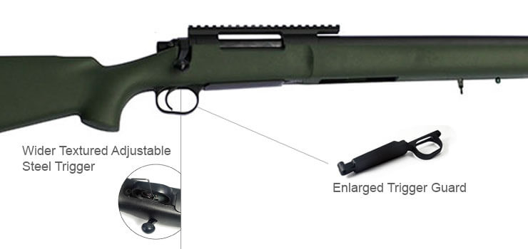 A wider, textured trigger allowing more sensitive shooting and easier adjustment.