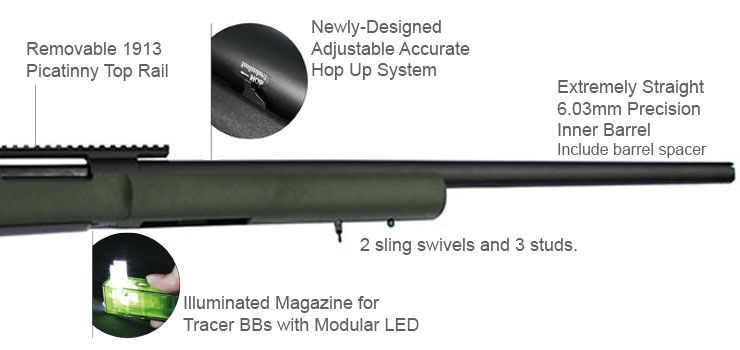 The Modify Airsoft Sniper Rifle MOD24 is built for shot-to-shot consistency and reliability of accuracy. The Modify MOD24 improves all-round an airsoft sniper's skills, by offering upgraded flexibility and hit rate with the newly-designed, adjustable, accurate Hop Up. Specially-made barrel spacer, accurate trajectory. A wider, adjustable, textured trigger; a removable Picatinny top rail for mounting sights; 2 sling swivels and 3 studs; adjustable Butt Stock; a steel cylinder and strengthened metallic internal parts. Its field credentials is complemented with non-glare, non-reflective finish for better camouflage. Every Modify MOD24 USR150 has gone through Airtightness tests.
